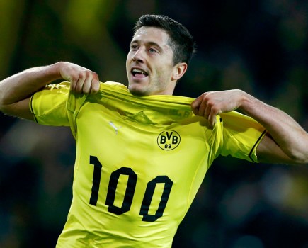 Robert Lewandowski scored his 100th goal for Borussia Dortmund to help them to a place in the German Cup final after beating Wolfsburg 2-0 to set them up for a possible final against new employers…