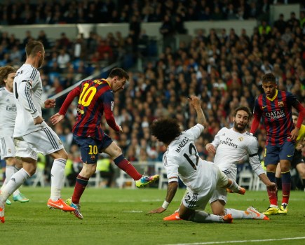 Andres Iniesta scores the first goal for Barcelona following a 24-pass move against Real Madrid in the clasico at the Bernabeu