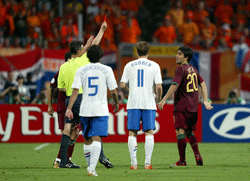 Ivanov, finally equalled the World Cup record when he showed Van Bronckhorst his second yellow card. It was Holland’s second red card, the match’s fourth red card and the 16th yellow card in total. Unfortunately, for the referee, who seemed intent on making his own piece of World Cup history, he failed to see van Persie pushing Ricardo in the final minute of stoppage time, for what surely would have been a 17th yellow card of the night.
